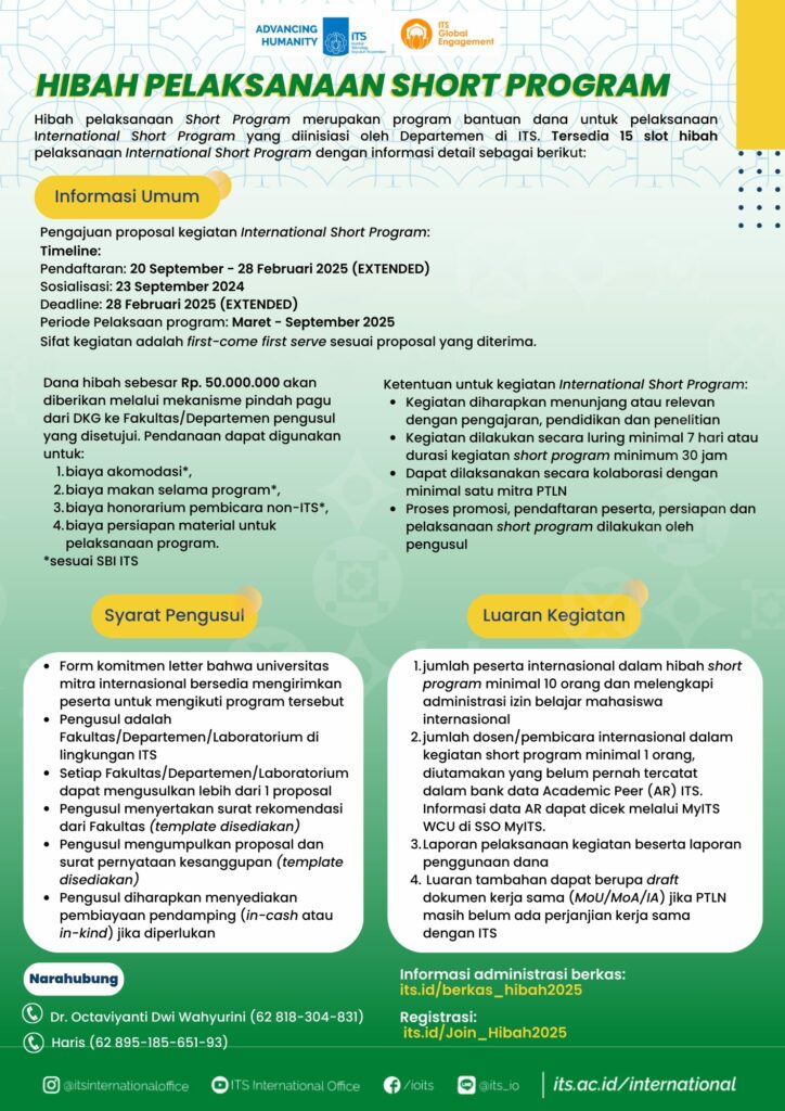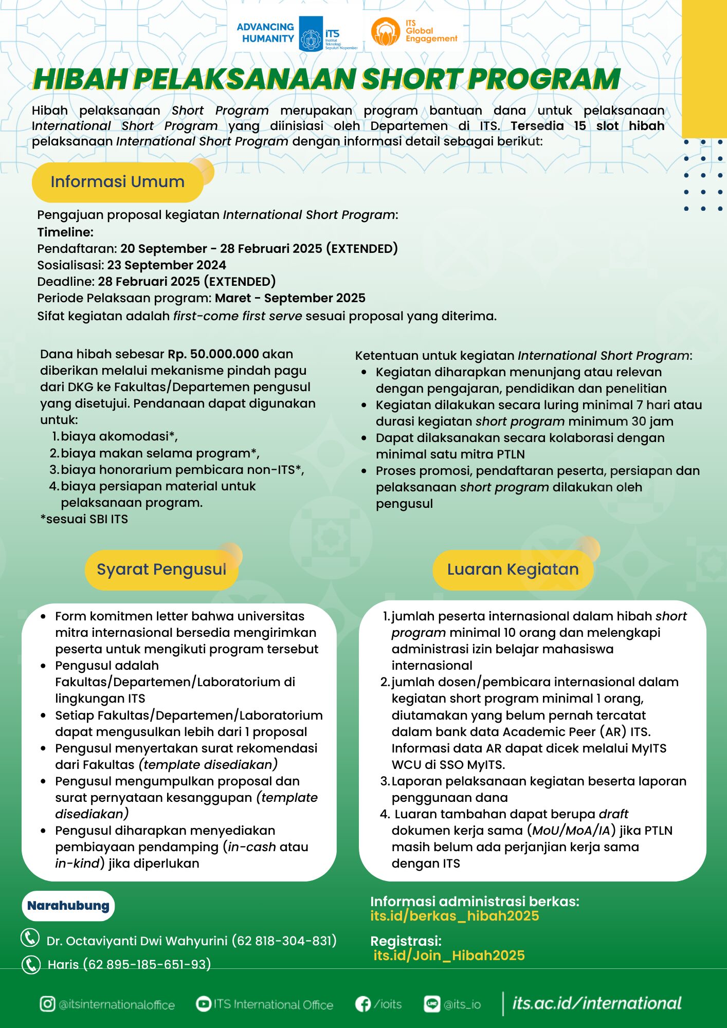 Institut Teknologi Sepuluh Nopember (ITS) senantiasa menujukkan komitmennya untuk meraih target menjad Top 500 World Class University dengan mengakselerasi internasionalisasi dengan melibatkan seluruh elemen di ITS, salah satunya melalui program Hibah Short Program yang menyediakan bantuan dana untuk mengundang lebih mahasiswa internasional untuk studi di ITS.