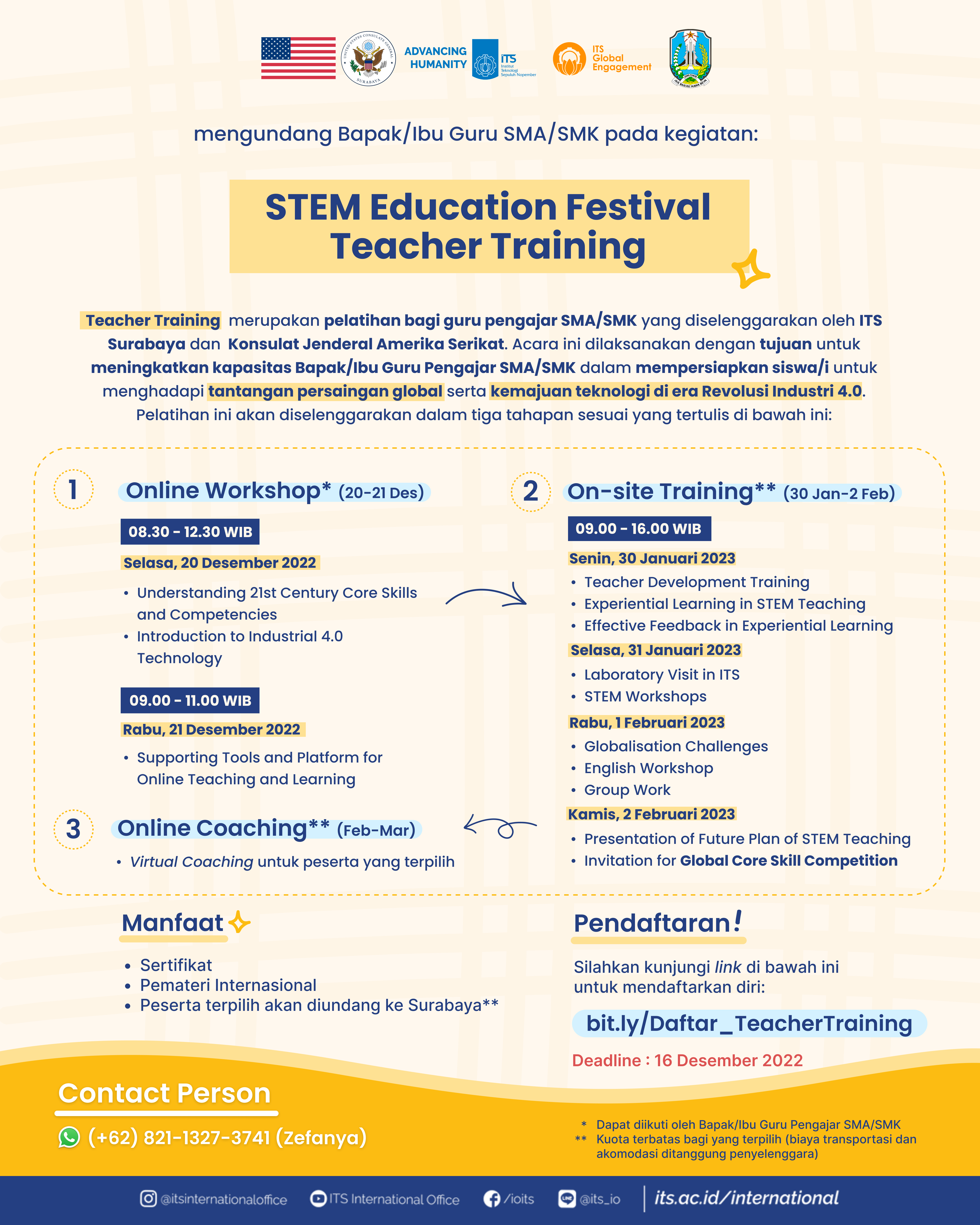 Science, Technology, Engineering, and Mathematics (STEM) Education Festival Teacher Training merupakan pelatihan bagi guru pengajar SMA/SMK yang diselenggarakan oleh ITS Surabaya dan Konsulat Jenderal Amerika Serikat dengan berkolaborasi dengan Science Hunter Indonesia (SHI). Program ini dilaksanakan dengan tujuan untuk meningkatkan kapasitas Bapak/Ibu Guru Pengajar SMA/SMK dalam mempersiapkan siswa/i untuk menghadapi tantangan persaingan global serta kemajuan teknologi di era revolusi industri 4.0. Pelatihan ini akan diselenggarakan dalam tiga (3) tahapan, yaitu: