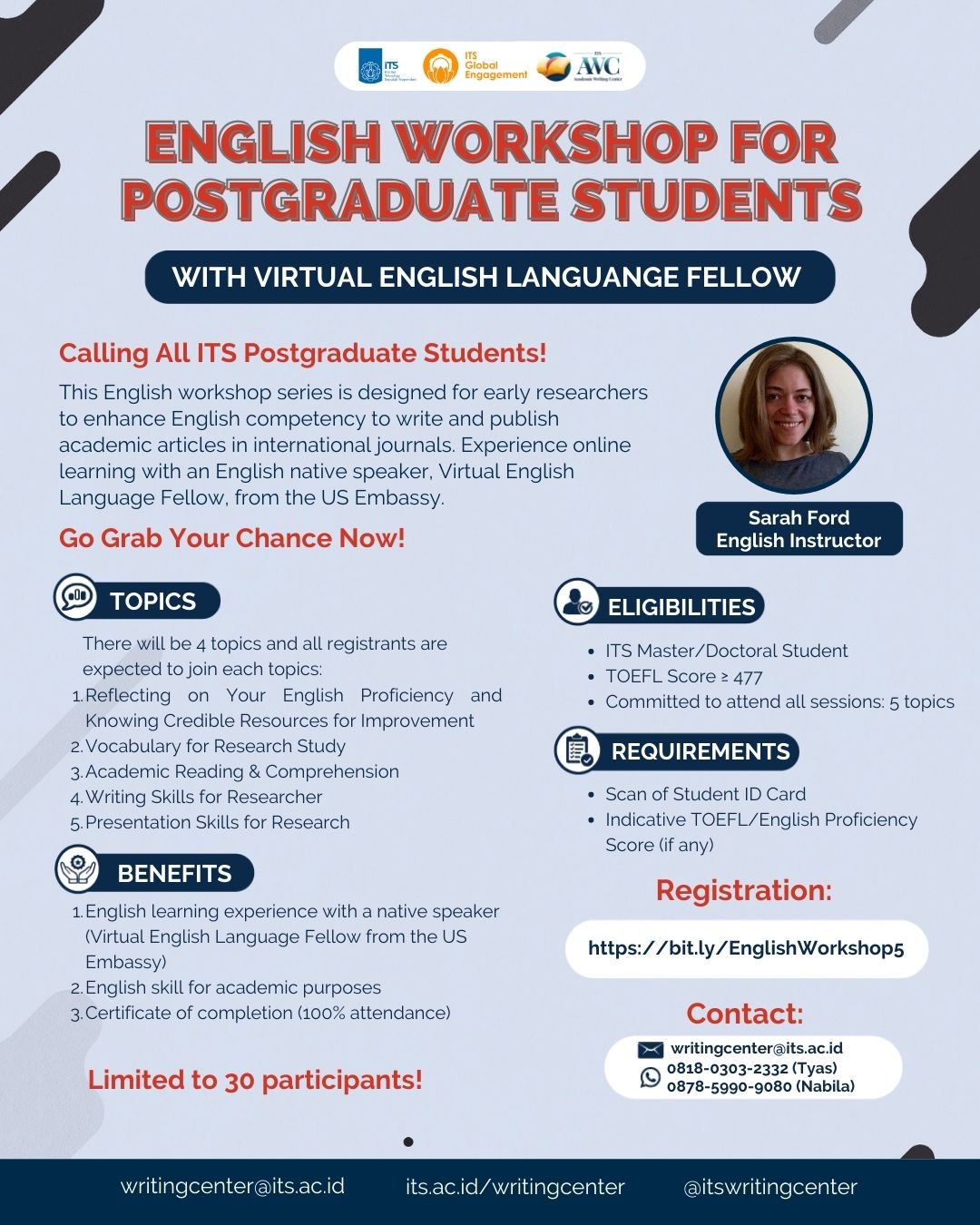Are you ready to build your professional profile and join international programs? Still confused on how to boost your English skill? Come and join English Workshop for Postgraduate Students! This online English workshop is specially brought to those who want to enhance their English competency, join international mobility programs, engage in conferences, or publish academic articles on international journals.