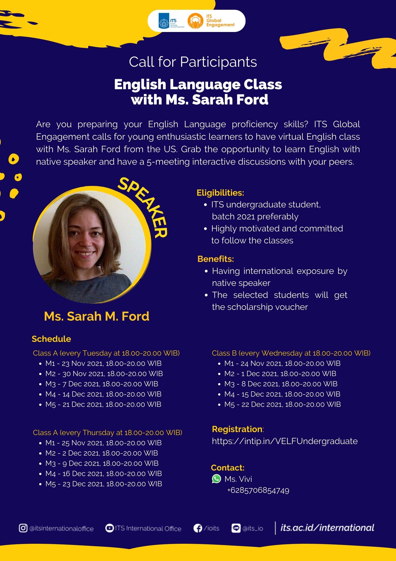 Virtual English Language Fellow (VELF) is a program between Institut Teknologi Surabaya (ITS) and Regional English Language Office (RELO) of U.S. Embassy. This program will be participated by ITS undergraduated student from International Undergraduate Program (IUP) and regular program. The students will be experiencing an international exposure and being taught by an English native speaker.