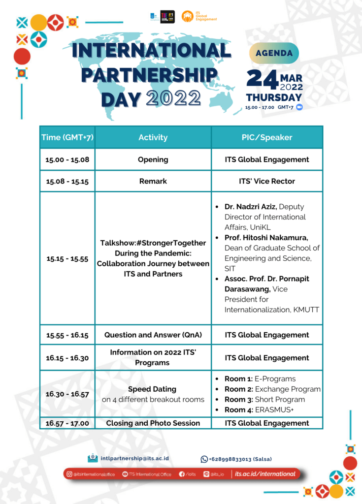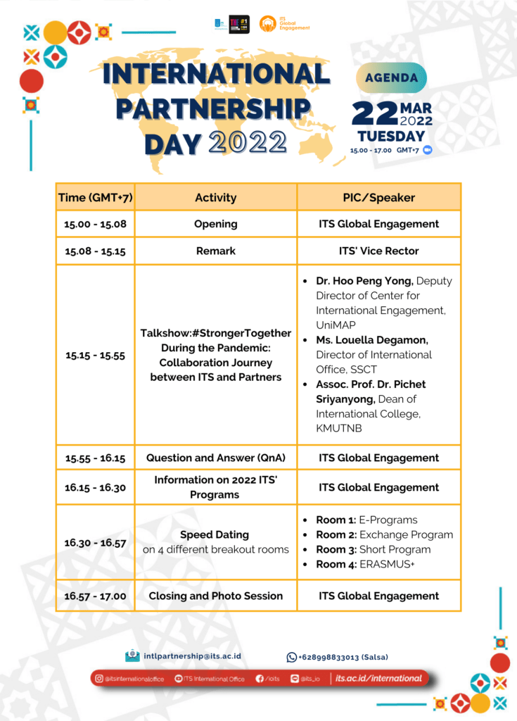 Amid the challenges caused by the COVID-19 pandemic, the importance of partnership as a powerful and significant tool to support HEIs to adapt and live with the new circumstances becomes more significant and important. Driven by such spirit, we proudly present International Partnership Day, with the theme of #StrongerTogether During the Pandemic: Collaboration Journey between ITS and Partners.