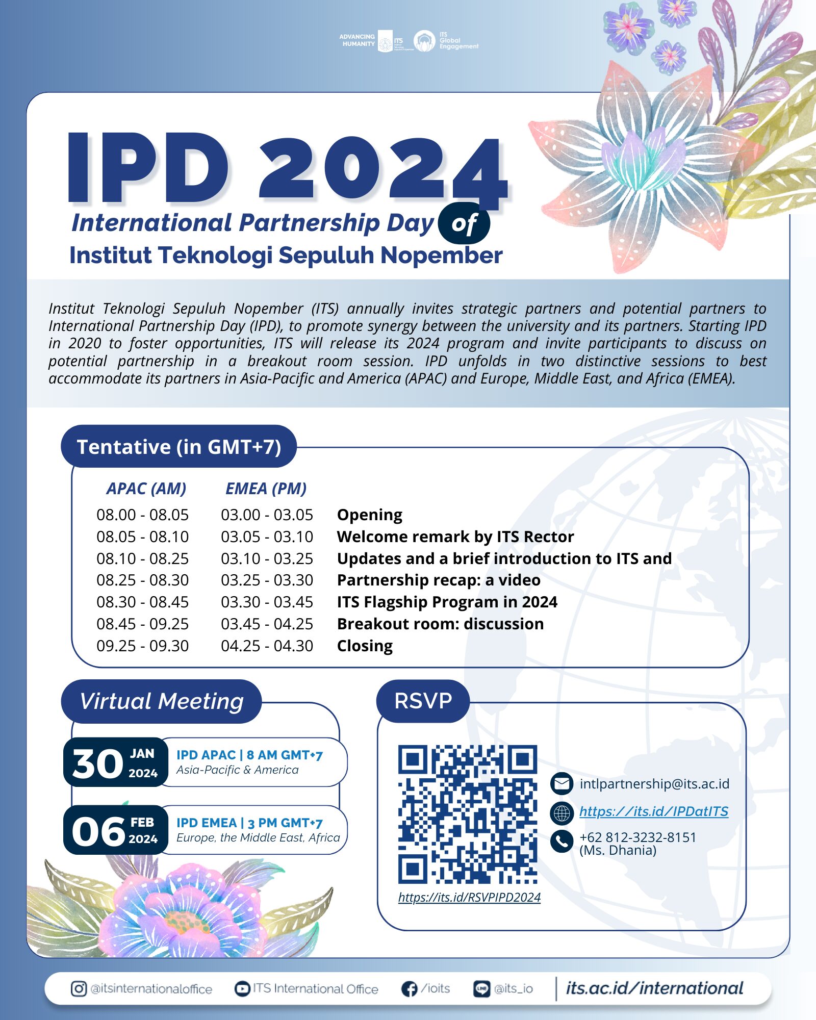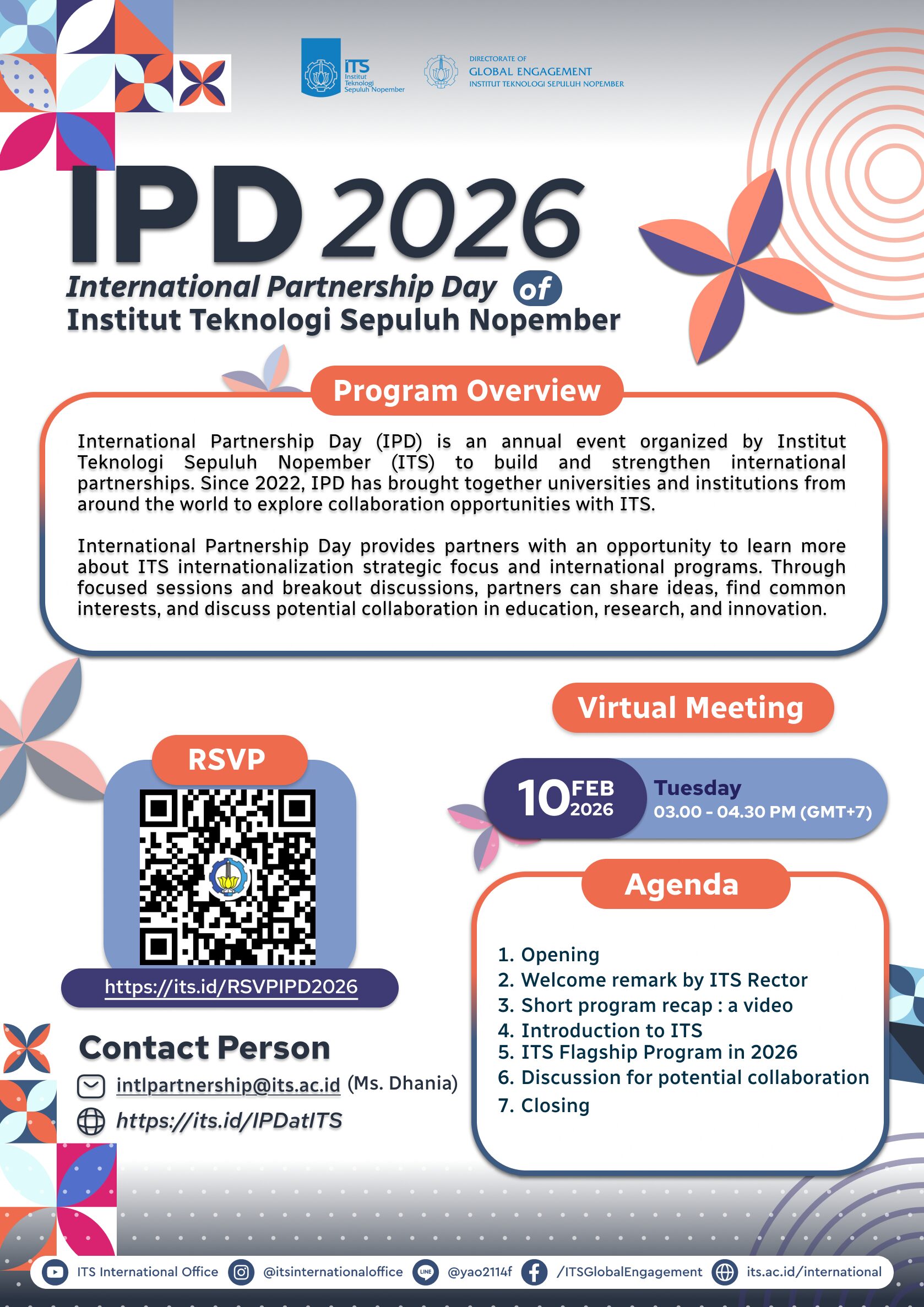 Since 2022, Institut Teknologi Sepuluh Nopember (ITS) has organized International Partnership Day (IPD) as an annual virtual forum to strengthen and expand its global engagement. The event serves as a strategic platform to nurture sustainable collaboration with international partner institutions while reinforcing ITS’s commitment to advancing internationalization in higher education.