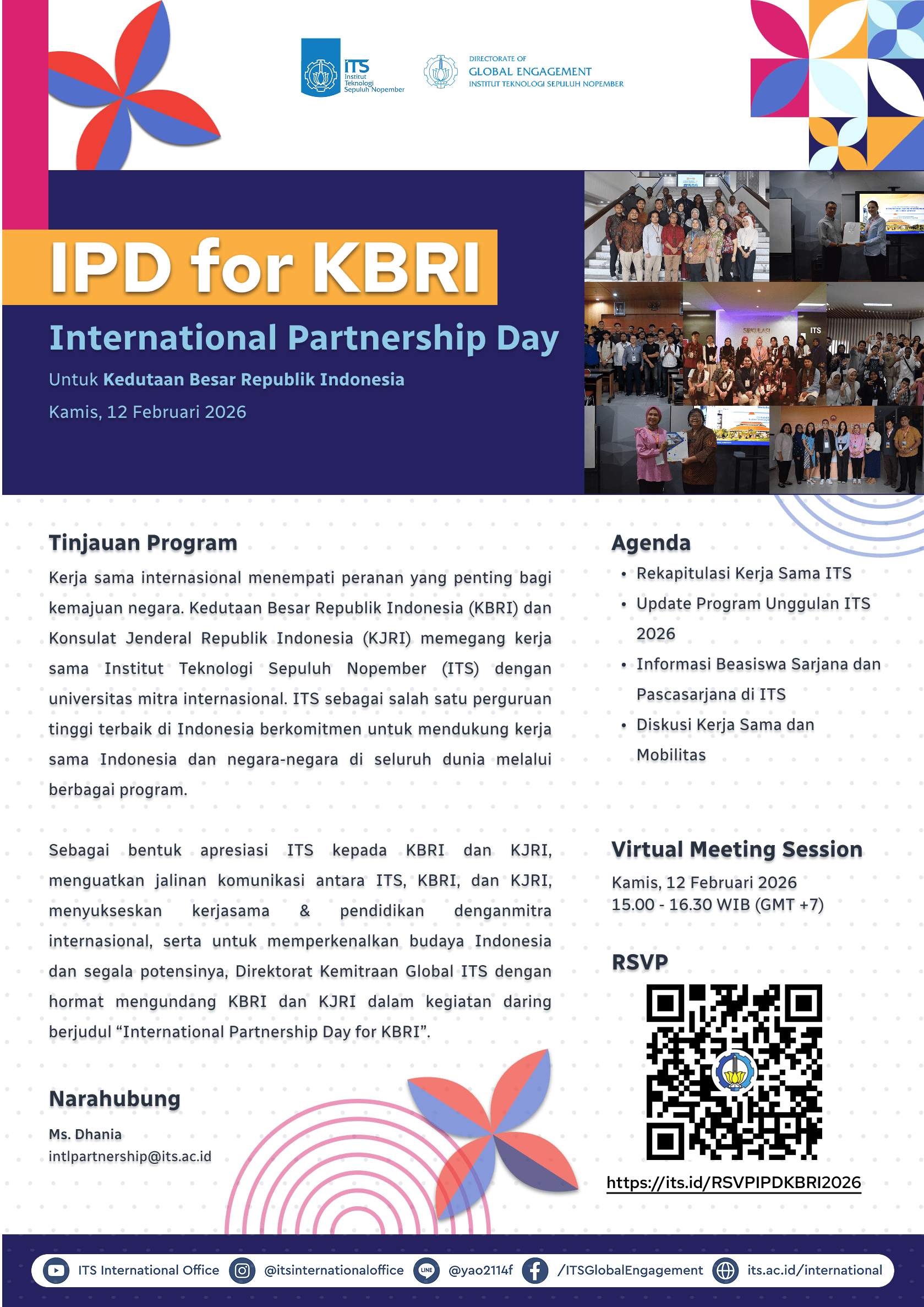 Sebagai bentuk apresiasi ITS kepada KBRI, menguatkan jalinan komunikasi antara ITS dan KBRI, menyukseskan kerjasama & pendidikan dengan mitra internasional, serta untuk memperkenalkan budaya Indonesia dan segala potensinya, Direktorat Kemitraan Global ITS dengan hormat mengundang KBRI dalam kegiatan daring berjudul “International Partnership Day for KBRI”.