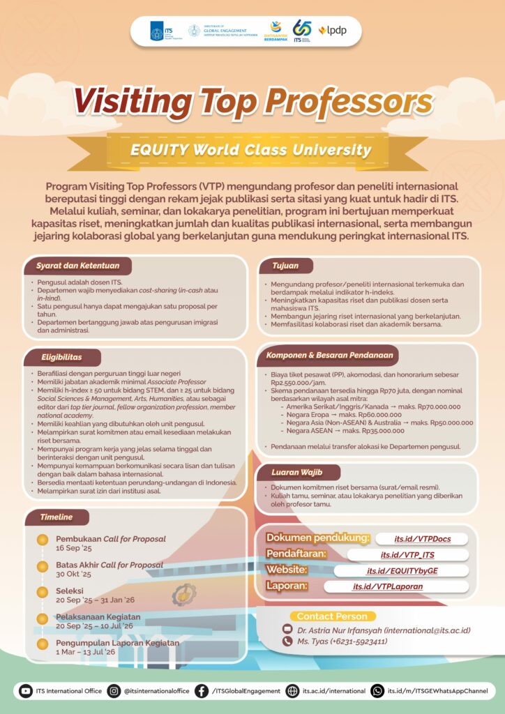 Visiting Top Professors (VTP) invites impactful international researchers as well as top-tier journal editors, professional fellows, or national academy members, to teach and conduct research workshops targeting top-tier journals at ITS.