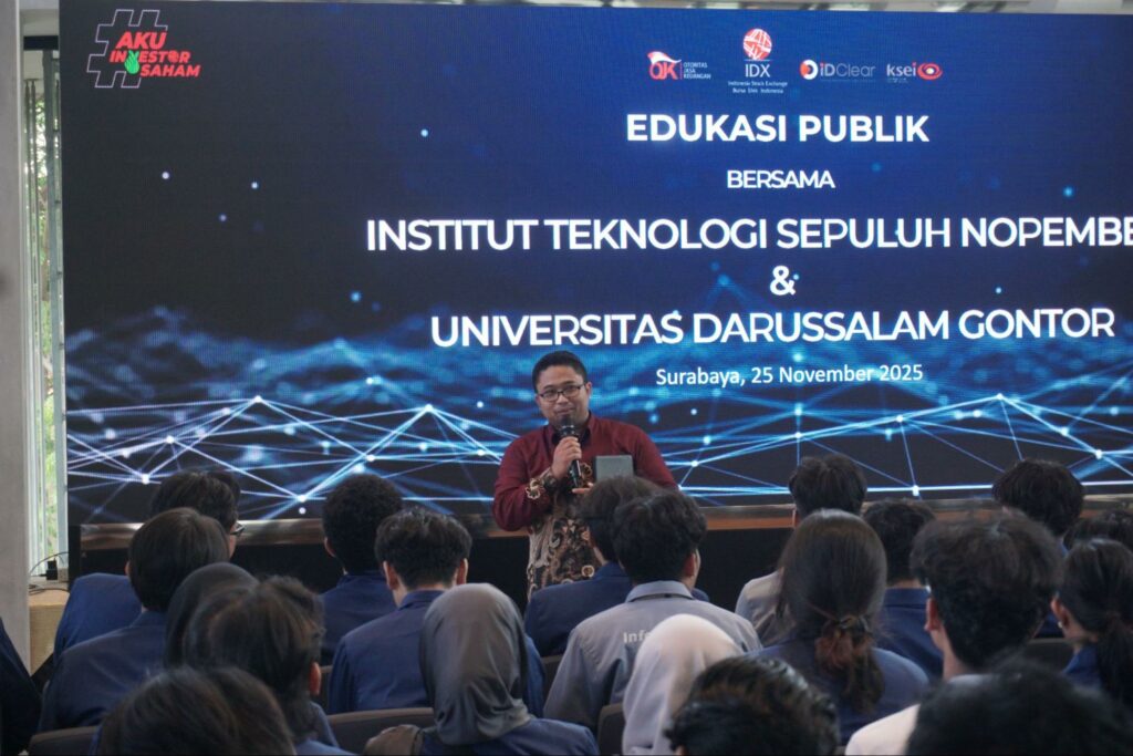 Asikin Ashar from IDX Surabaya delivers a public education session on financial literacy and stock investment to participants from Institut Teknologi Sepuluh Nopember (ITS) at IDX Bursa Efek Surabaya, Tuesday (25/11).
