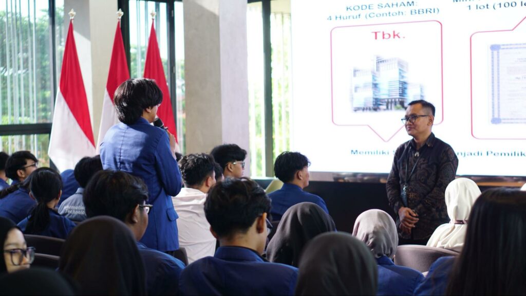 A student from the ITS Department of Information Technology asking a question during the interactive discussion session on investment and capital market mechanisms at IDX Bursa Efek Surabaya.