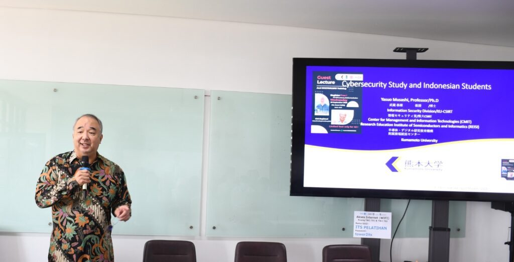 Acara sesi pertama di isi ole Profesor Yasuo Musashi, dari Kumamoto University Japan, memaparkan visi dan misi kampus dari Jepang Kumamoto, dan membahas cyber security standart ISO 27001, banyak peserta dari tamu dari Dinas Kominfo dan Pemda, belajar ilmu tentang manajemen keamanan Informasi.