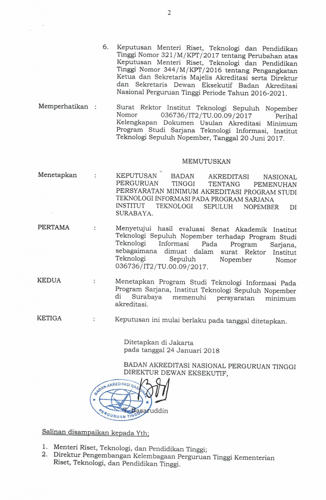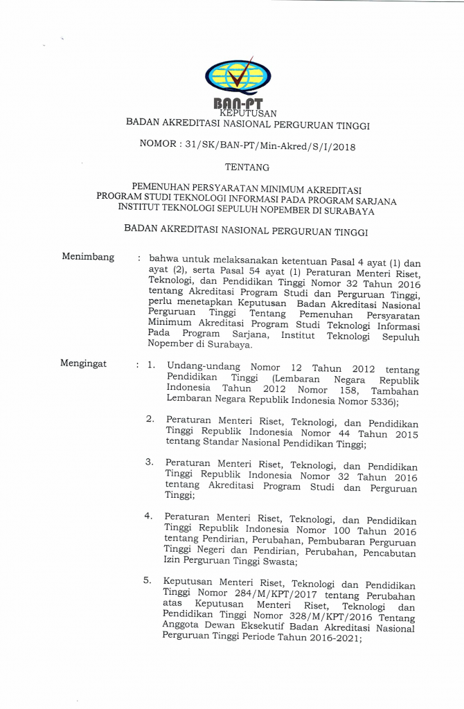 Departemen Teknologi Informasi di Institut Teknologi Sepuluh Nopember telah terakreditasi oleh BAN-PT