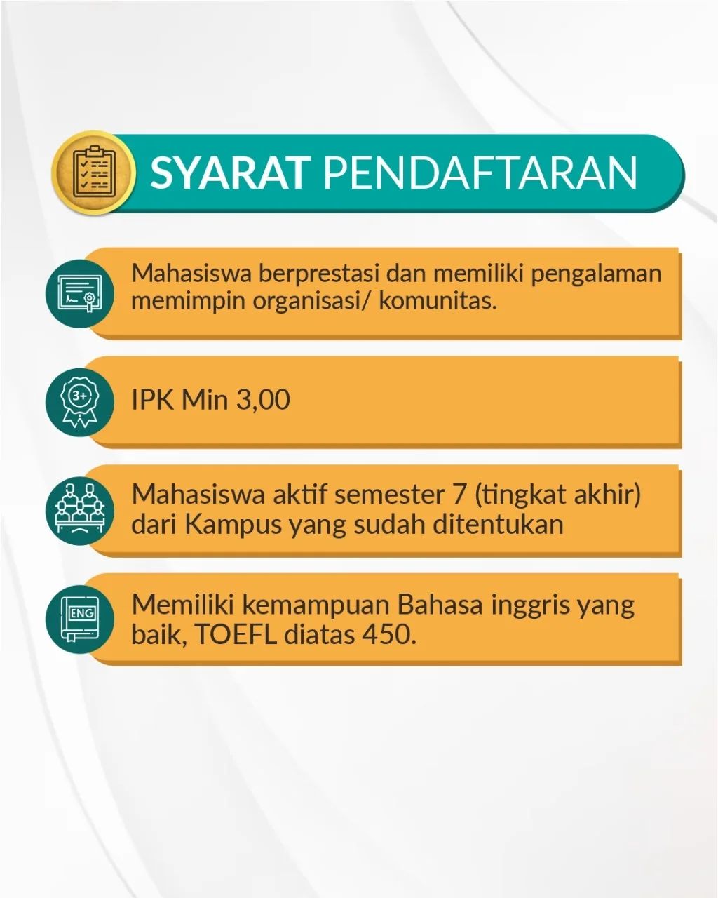 Untuk calon Sharia Young Leasers, jangan lupa untuk membaca dengan teliti semua syarat dan ketentuan yang berlaku. Jadilah bagian dari Sharia Young Leader bersama BSI Scholarship.