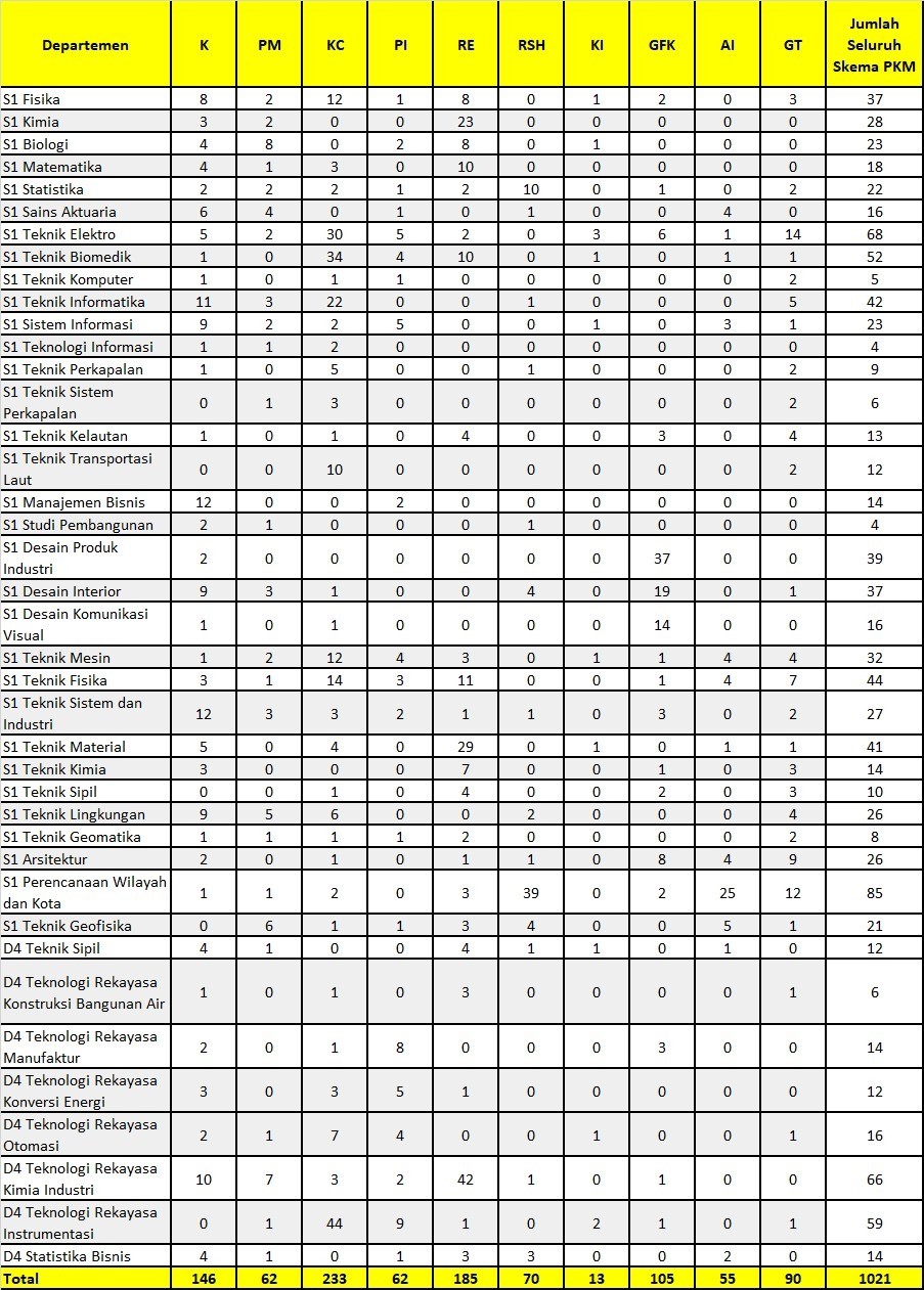 Hakun menjelaskan, dari 1.021 proposal yang diajukan ITS, Departemen Perencanaan Wilayah dan Kota (PWK) menjadi departemen dengan jumlah proposal unggah terbanyak sejumlah 85 proposal. Sedangkan, PKM Karsa Cipta menjadi bidang PKM dengan jumlah proposal unggah terbanyak di antara seluruh skema bidang dengan perolehan 233 proposal.
