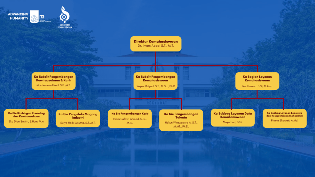 Dalam pelaksanaan tugasnya, Direktorat Kemahasiswaan ITS dibagi menjadi 2 Subdirektorat dan 1 Bagian, yakni: