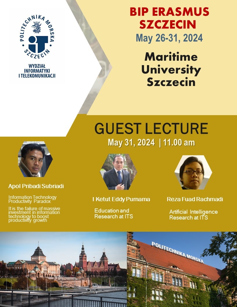 Pada tanggal 31 Mei 2024, Dosen Teknik Komputer ITS Prof. Dr. I Ketut Eddy Purnama, S.T., M.T. diberi kesempatan untuk mengajar pada Guest Lecture di Maritime University of Szczecin, Polandia. Guest Lecture tersebut bertema “Education and Research at ITS” dan Reza Fuad Rachmadi, S.T.,M.T.,Ph.D diberi kesempatan untuk mengajar pada Guest Lecture dengan tema “Artificial Intelligence Research at ITS”.