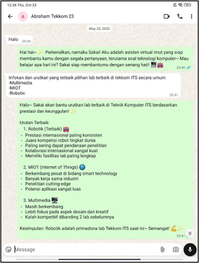 Dalam program tersebut, tim pengembang berhasil menciptakan SAKAI, sebuah chatbot WhatsApp berbasis Artificial Intelligence (AI) dengan teknologi Retrieval-Augmented Generation (RAG) yang dirancang untuk membantu, mempercepat, dan menyederhanakan layanan administrasi mahasiswa. Inovasi ini hadir sebagai jawaban atas tantangan administratif modern yang membutuhkan kecepatan, konsistensi, serta akses layanan 24/7 tanpa batasan jam kerja.