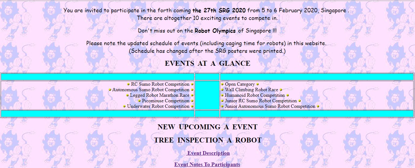 The 27th Singapore Robotic Games 2020 diselenggarakan bekerja sama dengan IEEE Robotics and Automation Society Singapore Chapter, oleh: Institute for Technical Education, Robotic Games Society (Singapura), Politeknik Nanyang, Universitas Teknologi Nanyang, Universitas Teknologi Singapura, Universitas Nasional Singapura, Ngee Ann Polytechnic, Republic Politeknik, Politeknik Singapura, Pusat Sains Singapura dan Politeknik Temasek.