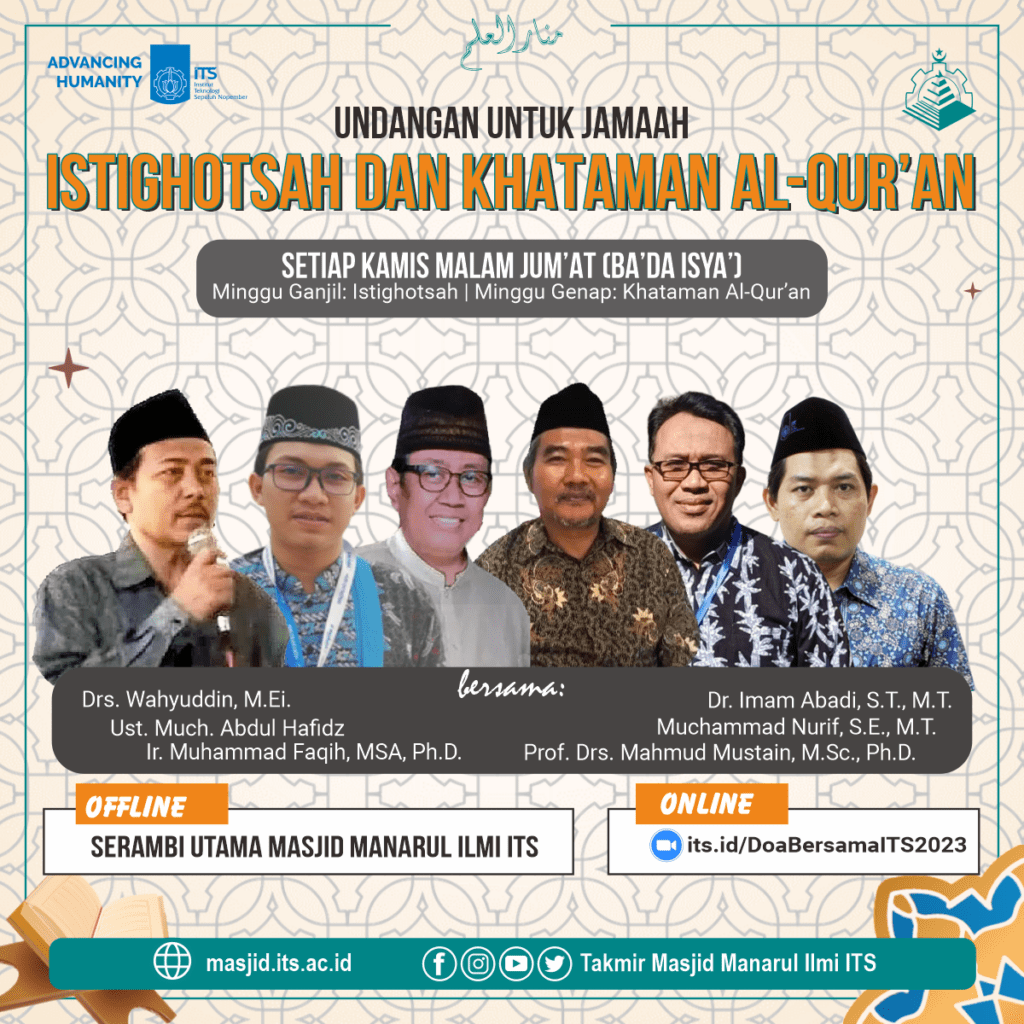 Kami mengundang seluruh jamaah untuk bergabung dalam Istighotsah dan Khataman Al-Qur’an di Masjid Manarul Ilmi ITS Surabaya. Anda dapat hadir langsung di ruang utama masjid atau mengikuti secara virtual melalui Zoom di https://its.id/DoaBersamaITS2023.