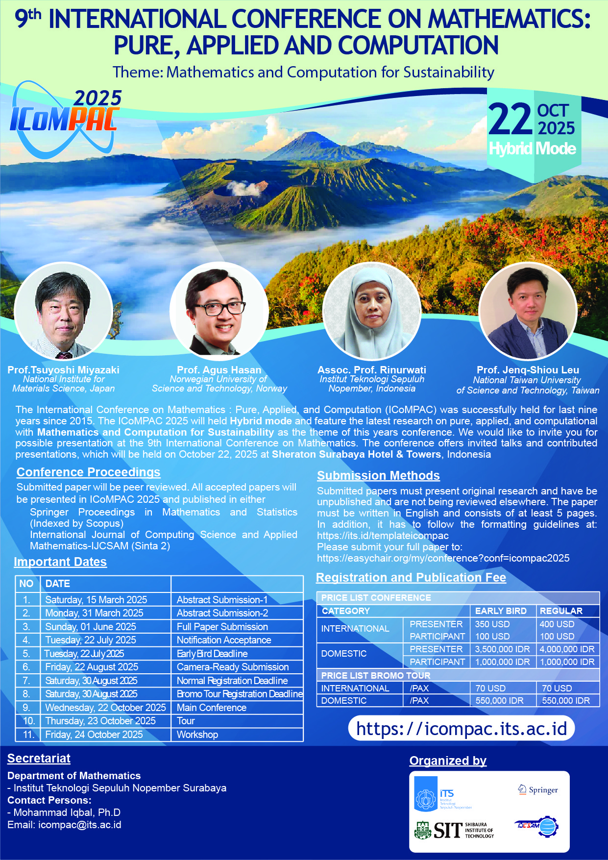 9The International Conference on Mathematics : Pure, Applied, and Computation (ICoMPAC) was successfully held for last nine years since 2015. The ICoMPAC 2025 will held Hybrid mode and feature the latest research on pure, applied, and computational with Mathematics and Computation for Sustainability as the theme of this years conference. We would like to invite you for possible presentation at the 9th International Conference on Mathematics. The conference offers invited talks and contributed presentations, which will be held on October 22, 2025 at Sheraton Surabaya Hotel & Towers, Indonesia