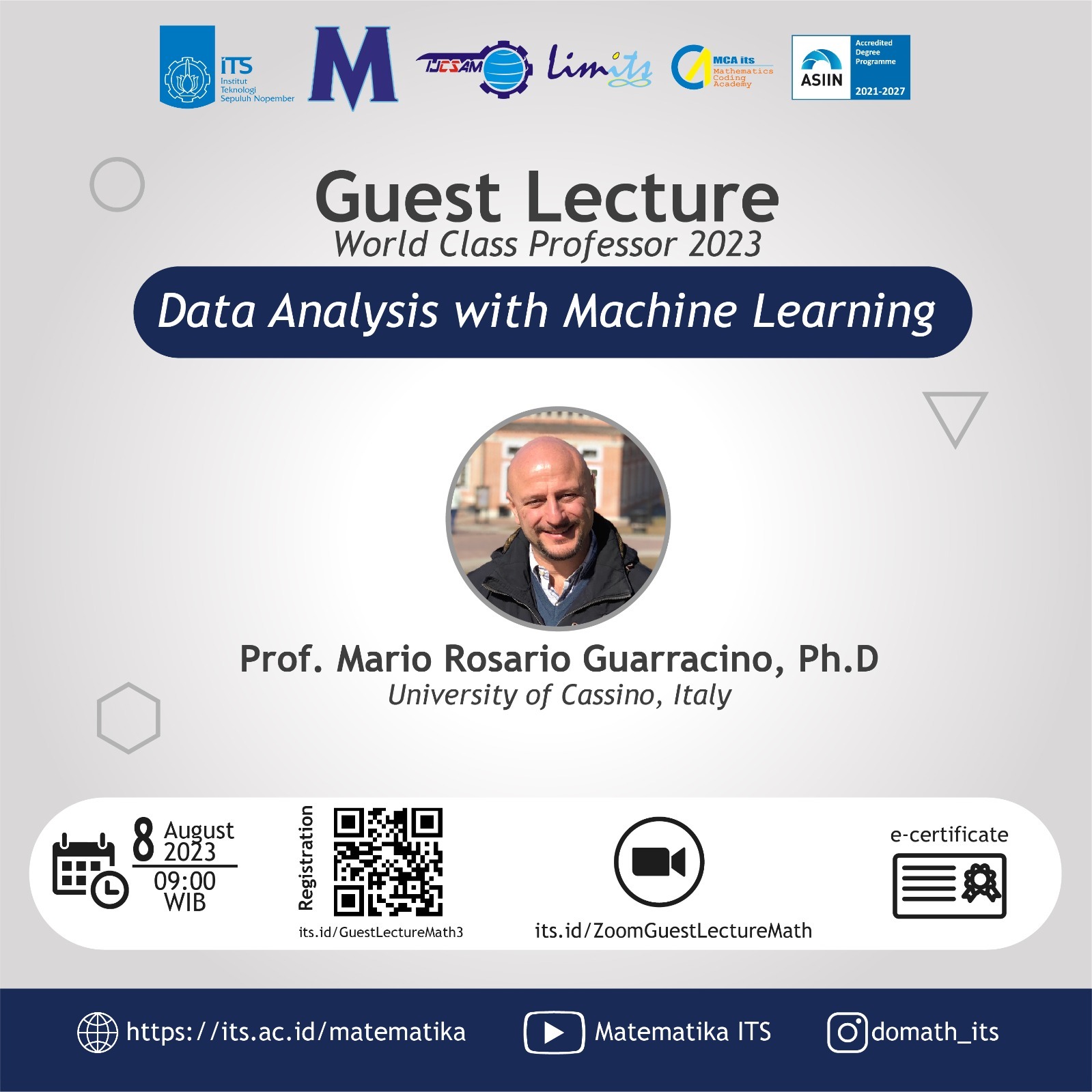 Departemen Matematika akan menyelenggarakan International Guest Lecture dengan tema Data analysis with machine learning yang akan disampaikan oleh Prof. Mario Rosario Guarracino, Ph.D , University of Cassiono, Italy. Kegiatan ini merupakan rangkaian dari World Class Professor 2023 ITS yang di peroleh Prof. Dr. M. Isa Iraawn, MT acara akan diselenggarakan secara online.