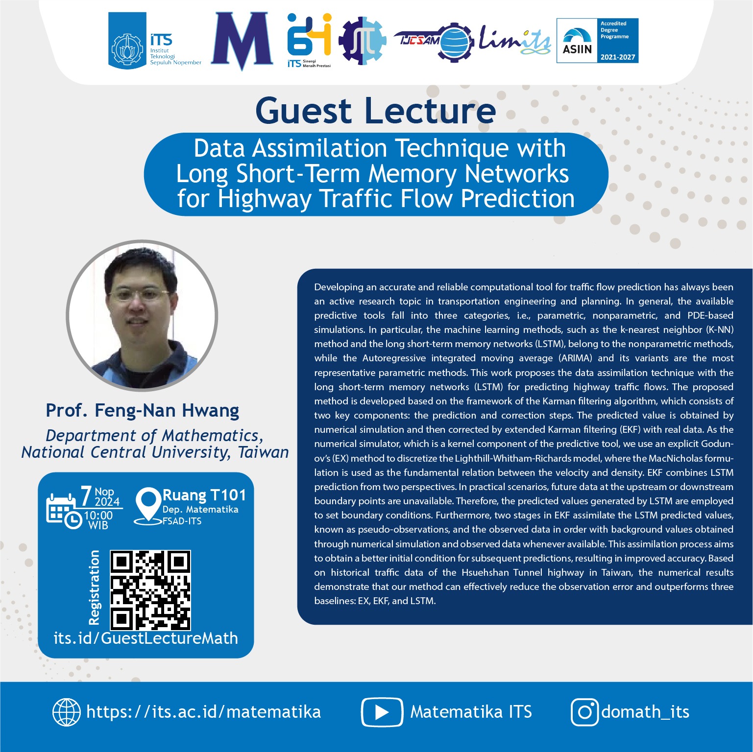 Departemen Matematika Institut Teknologi Sepuluh Nopember (ITS) akan menggelar International Guest Lecture yang bertajuk “Data Assimilation Technique with Long Short-Term Memory Networks for Highway Traffic Flow Prediction” pada tanggal 7 November 2024. Dalam kegiatan ini, ITS menghadirkan pembicara Prof. Feng-Nan Hwang dari Department of Mathematics, National Central University, Taiwan. Kegiatan ini diharapkan memberikan wawasan berharga bagi para mahasiswa, dosen, dan peneliti terkait teknik modern dalam memprediksi arus lalu lintas menggunakan metode pembelajaran mesin.