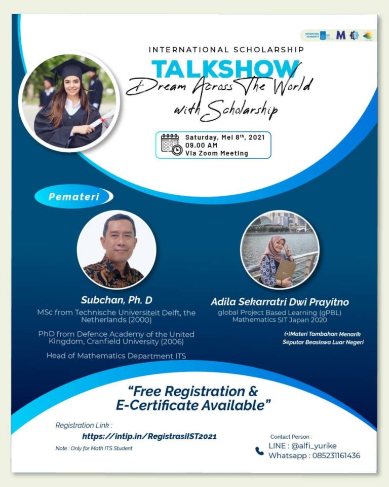 Departemen Matematika ITS akan menyelenggarakan kegiatan International Scholarship Talkshow dengan tema “Dream Across The
