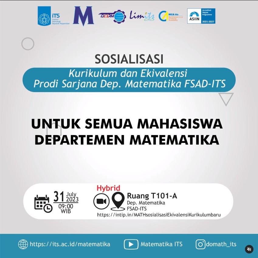 Departemen Matematika FSAD-ITS akan menylenggarakan kegiatan Sosialisasi Kurikulum 2023 dan Ekivalensi Prodi Sarjana Matematika FSAD-ITS untuk semua mahasiswa, dilaksanakan pada hari Senin 31 Juli 2023 pukul 09.00 WIB secara hibryd di kelas T101 dan zoom melalui link https://intip.in/MATHsosialisasiEkivalensiKurikulumbaru