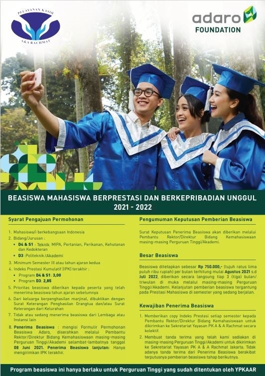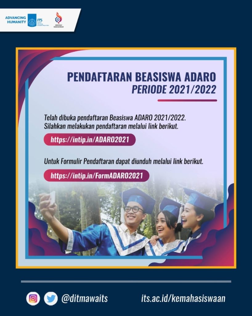 Beasiswa Mahasiswa Berprestrasi dan Berkepribadian Unggul 2021-2022 Formulir pendaftaran https://intip.in/FormADARO2021 pendaftaran intip.in/ADARO2021