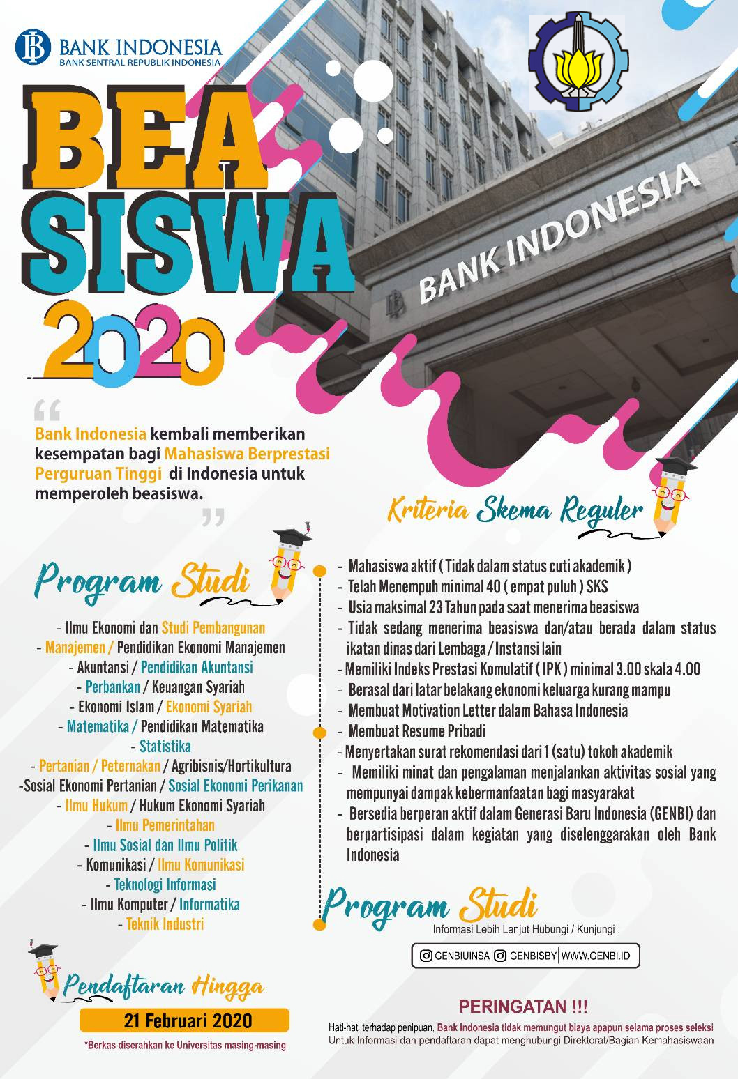 Bank Indoensia kembali memberikan kesempatan bagi mahasiswa berprestasi perguruan tinggi di Indonesia untuk memperoleh beasiswa.