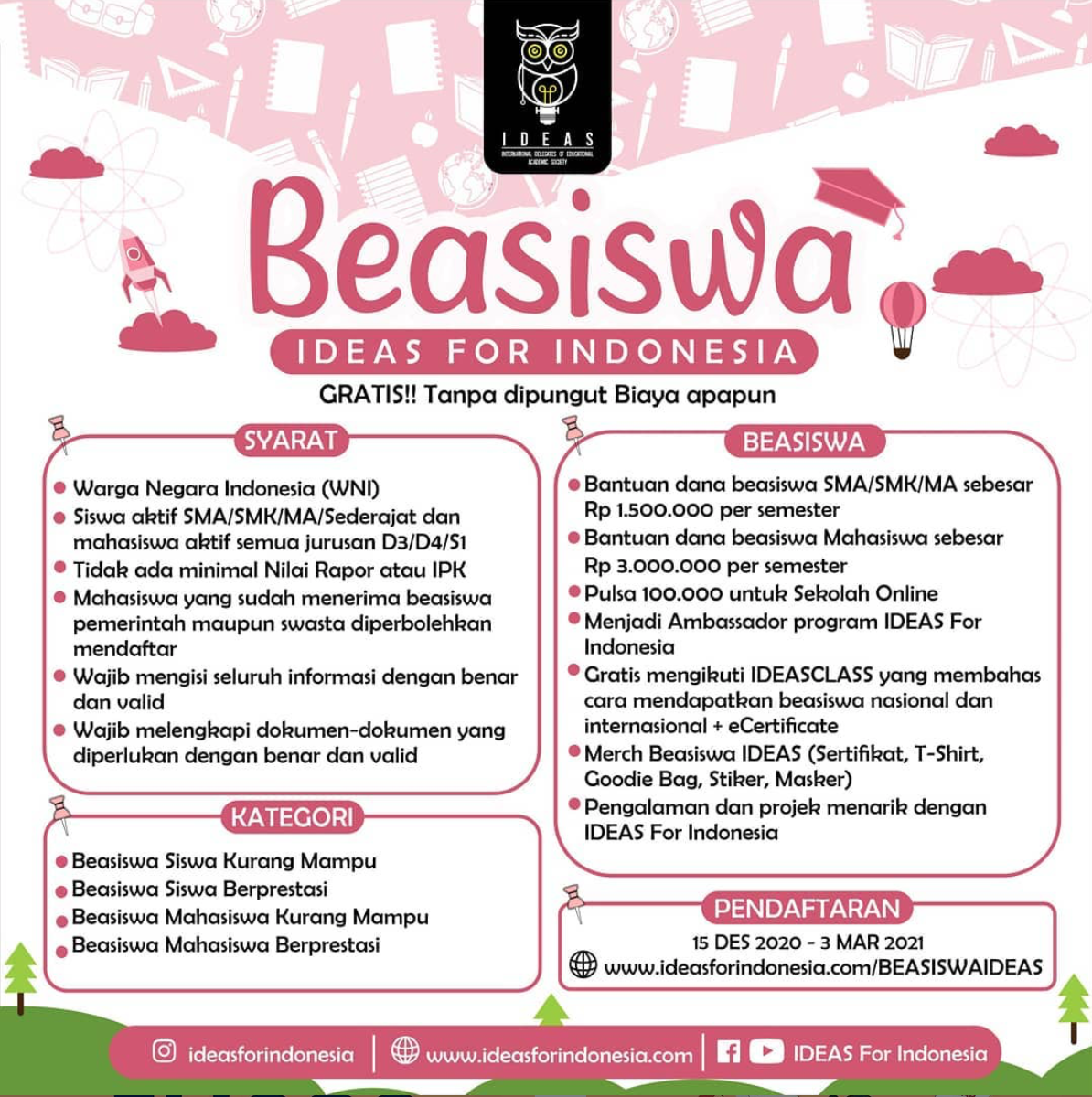 Pendaftaran: 15 Desember 2020-3 Maret 2021 www.ideasforindonesia.com/BEASISWAIDEAS