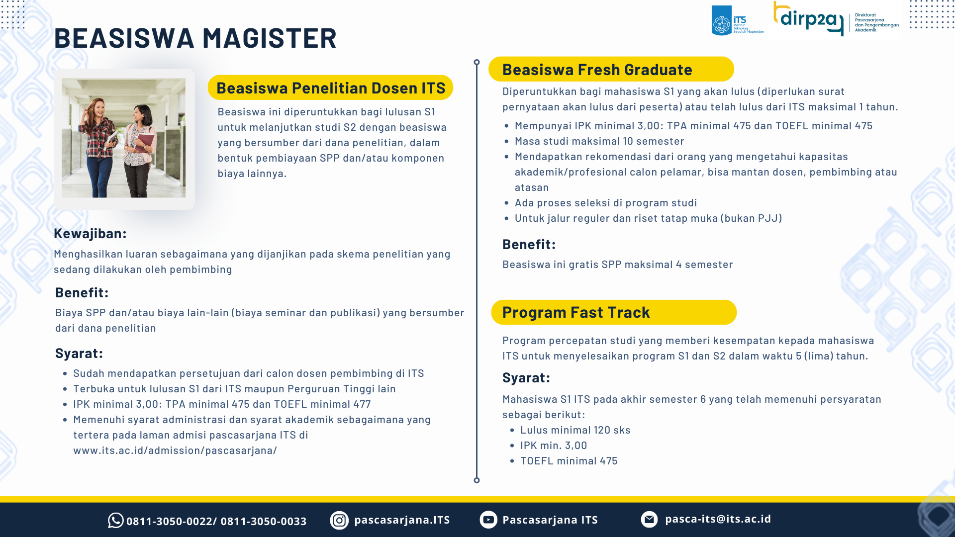 Beasiswa ini diperuntukkan bagi lulusan S1 untuk melanjutkan studi S2, dengan beasiswa yang bersumber dari dana penelitian, dalam bentuk pembiayaan SPP dan/atau komponen biaya lainnya.