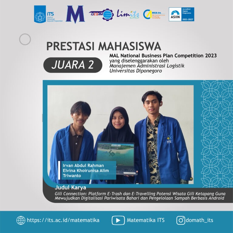 Departemen Matematika ITS mengucapkan selamat kepada Irvan Abdul Rahman, Elvina Khoirunisa Alim, Triwanto (Tim