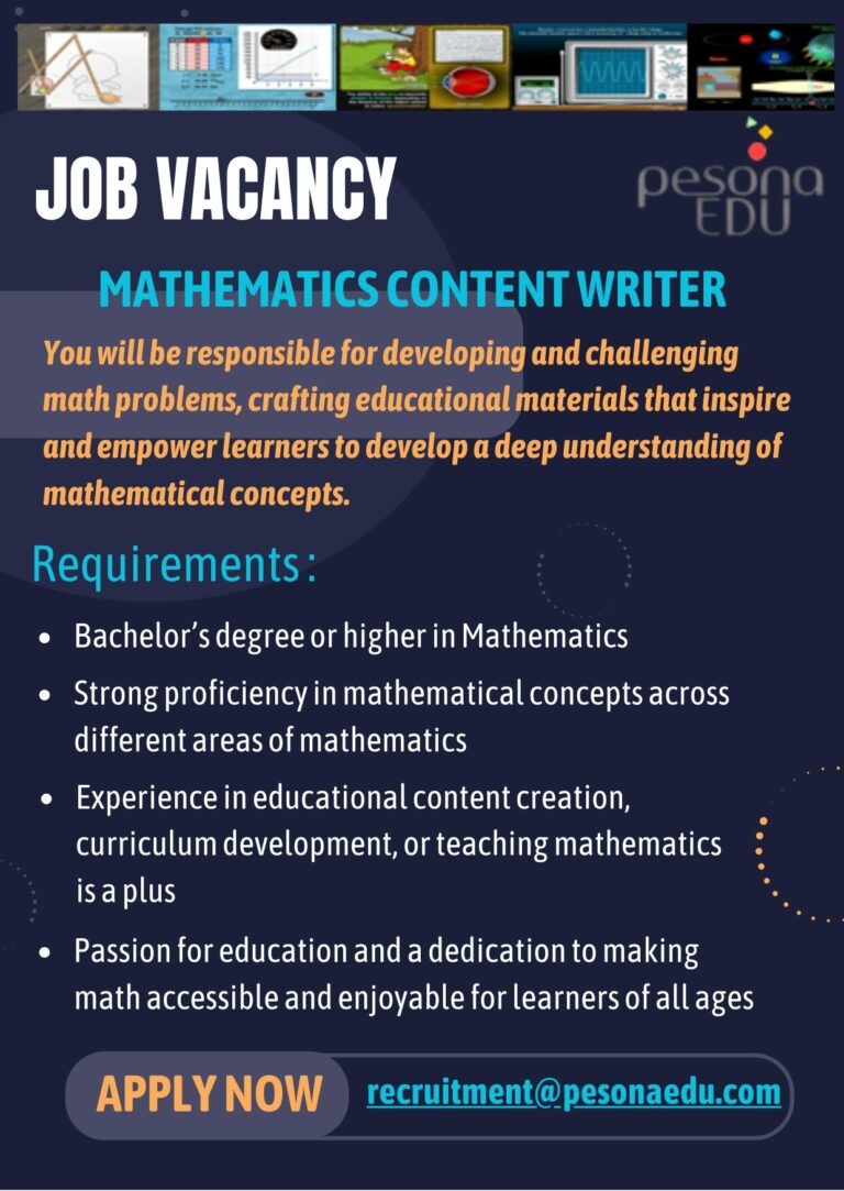 JOB VACANCYMATHEMATICS CONTENT WRITER You will be responsible for developing and challenging math problems,