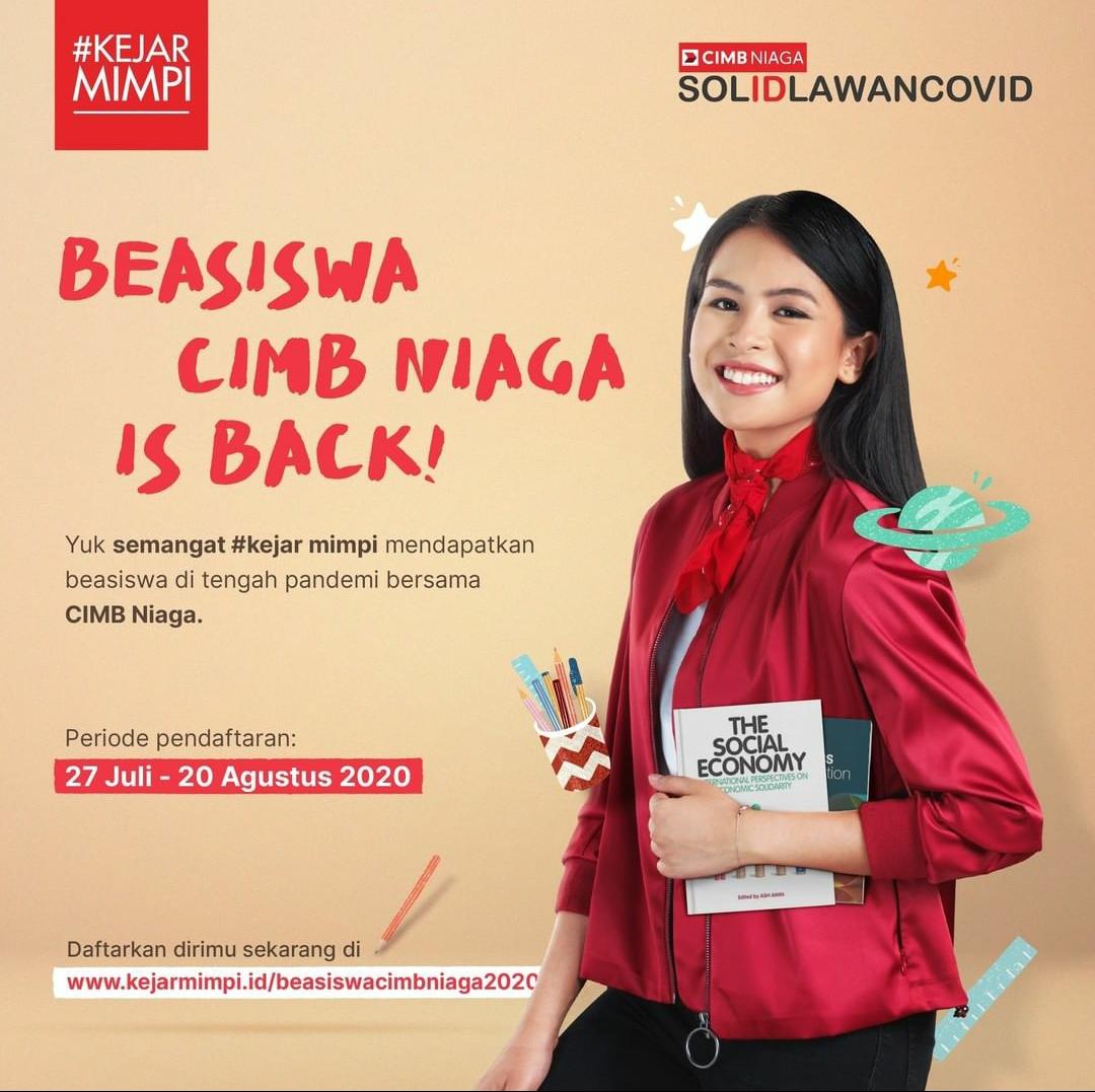 Oleh karena itu, program Beasiswa CIMB Niaga kembali hadir di tahun 2020 untuk mendorong semangat para mahasiswa agar terus berprestasi sekalipun dalam masa sulit. Harapannya, program Beasiswa CIMB Niaga mampu meningkatkan pendidikan di Indonesia yang berkelanjutan serta mempersiapkan generasi penerus bangsa yang berkuaitas.