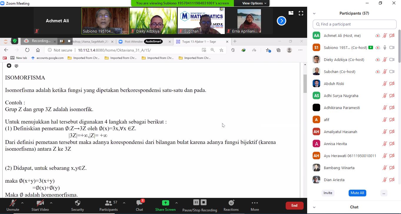 Sabtu 17 Oktober 2020 Departemen matematika telah melaksanakan kegiatan pelatihan dengan tema “Workshop Pembelajaran Matematika Secara Daring dengan Sage” yang akan di sampaikan oleh Prof. Dr.Subiono, M.S. kegiatan pelatihan yang dilaksanakan secara online via zoom diikuti oleh 80 peserta.