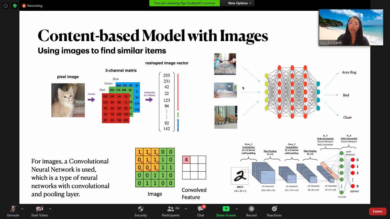 Senin 14 September 2020 departemen Matematika ITS telah melaksanakan kegiatan kuliah tamu dengan tema “Data Science pada Aplikasi Sistem Rekomendasi” yang di sampaikan oleh alumni 2016 Putu Ayu G. Sudyanti, Ph.D. Wanita yag biasa sisapa Ayu sekarang berkerja dibidang Machine Learning Scientist pada perusahaan Overstock.com USA ini sangat senang karna bisa berbagi ilmu dan pengalaman beliau di hadapan peserta baik mahasiswa, dosen dan peserta dari luar ITS.