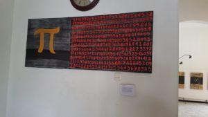 Salah satu karya lukis Cak Des di depan pintu masuk ruang utama pameran adalah obyek ilmiah yaitu 1 tidak sama dengan 1.