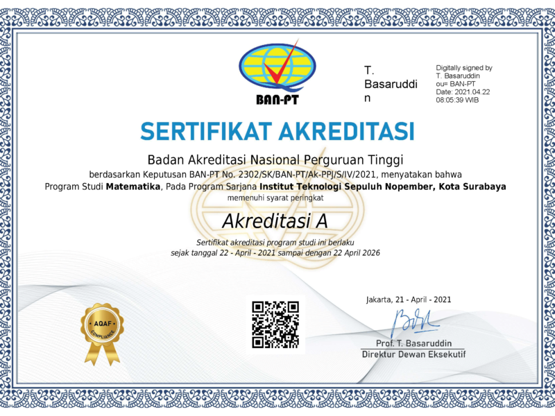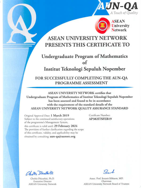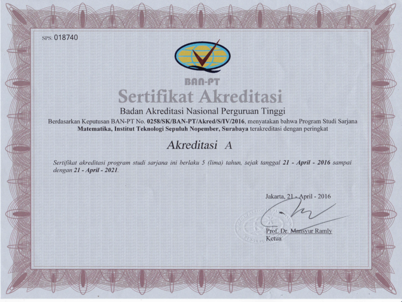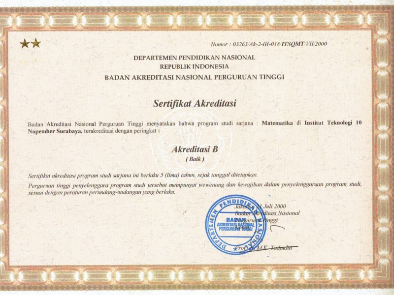 Departemen Matematika ITS memiliki reputasi di tingkat nasional dan Internasional. Hal ini dibuktikan dengan akreditasi dan sertifikat yang menjamin kualitas pendidikan dan penelitian di Departemen Matematika. Temukan Informasi mengenai akreditasi dan sertifikat yang dimiliki Matematika disini,