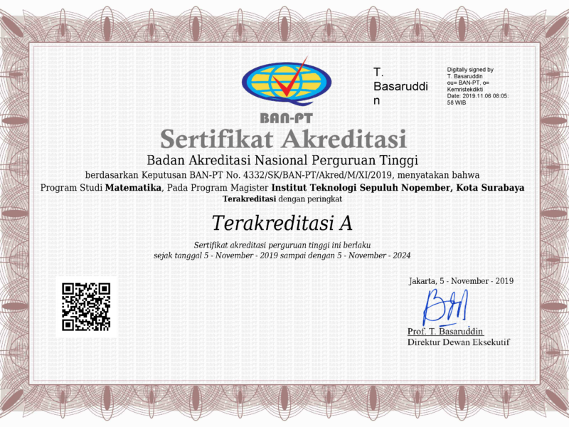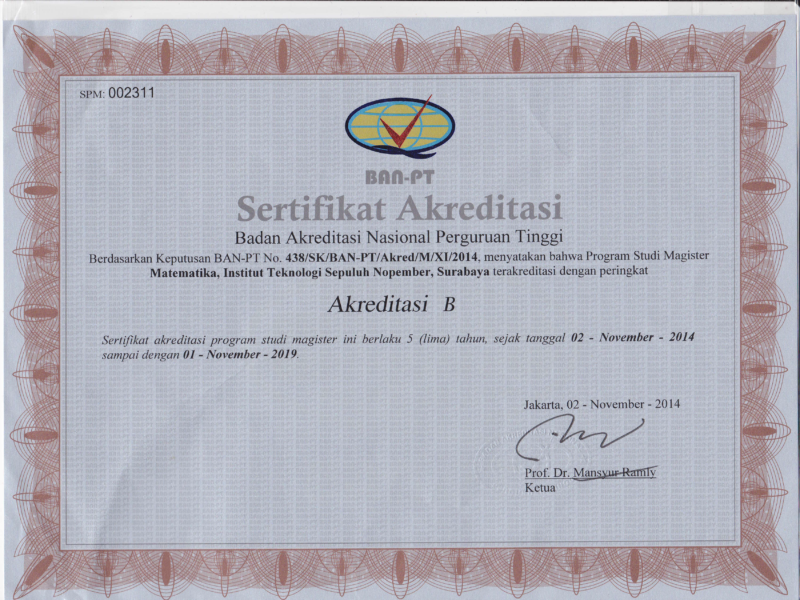 Departemen Matematika ITS memiliki reputasi di tingkat nasional dan Internasional. Hal ini dibuktikan dengan akreditasi dan sertifikat yang menjamin kualitas pendidikan dan penelitian di Departemen Matematika. Temukan Informasi mengenai akreditasi dan sertifikat yang dimiliki Departemen Matematika disini,