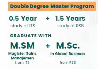 Postgraduate student will study the first semester at ITS, followed by study for 3 semesters at RSB to finish their Double Degree Master study. Upon completion, you will earn two degrees at the same time i.e. Magister Sains Manajemen (M.SM) from ITS, and M.Sc in Global Business from RSB.