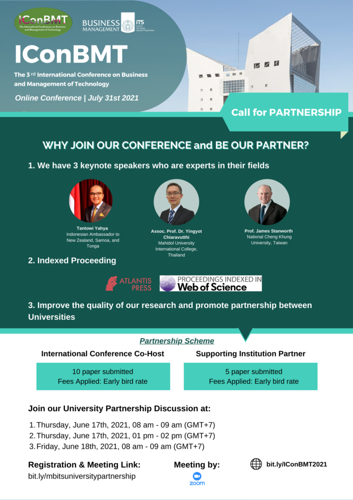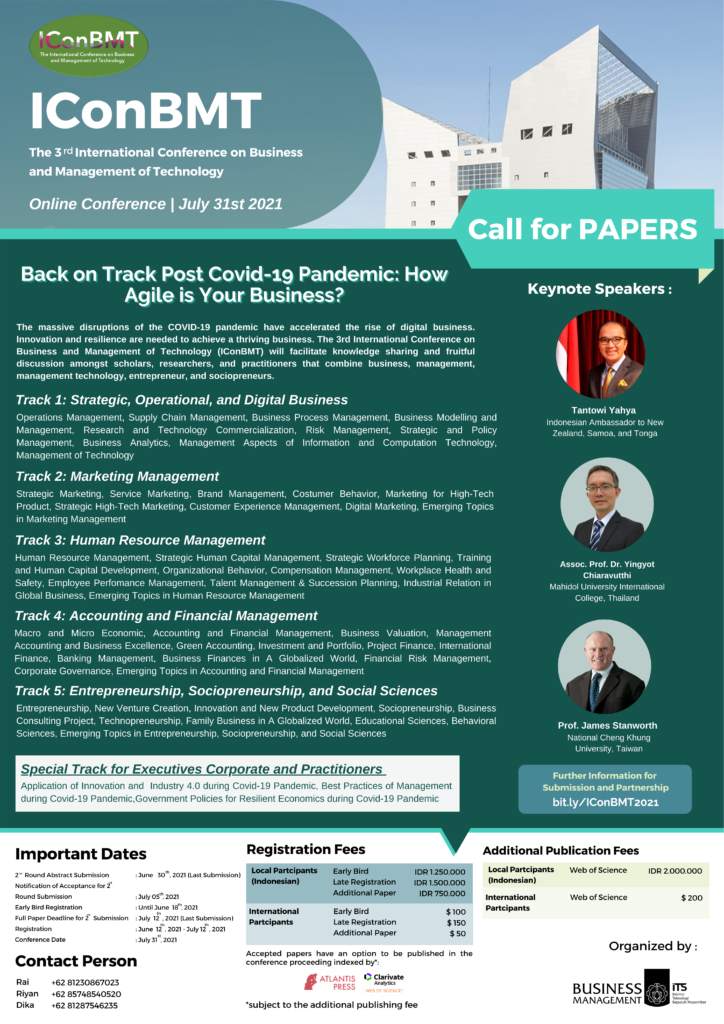 We would like to inform that we extend abstract submission deadline until June 07th, 2021. The 3rd International Conference on Business and Management of Technology (IConBMT 2021) will be held online at July 31st, 2021. We invite corporate executives and scholars to share and discuss how to handle the effect of COVID-19 pandemic on business as this year conference will have theme “Back on Track Post COVID-19 Pandemic: How Agile is Your Business?”