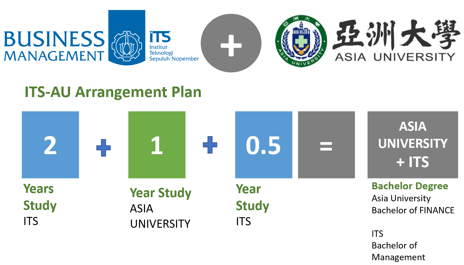 Para mahasiswa yang diterima dalam program ini akan mendaftar di ITS-Indonesia dan AU-Taiwan. Mahasiswa ITS harus memiliki setidaknya 80 SKS ITS, mereka akan menghabiskan dua hingga tiga semester di AU-Taiwan dengan mengambil SKS yang dibutuhkan untuk memenuhi 144 SKS wajib. Mahasiswa ITS akan belajar empat semester pertama (2 tahun) di ITS, dilanjutkan dengan dua semester (satu tahun) lainnya di Asia University, kemudian kembali ke ITS pada semester akhir untuk menyelesaikan skripsi sarjananya. Setelah selesai, mahasiswa akan mendapatkan dua gelar secara bersamaan, yaitu Bachelor of Management (SM) dari ITS dan Bachelor of Finance dari Asia University.