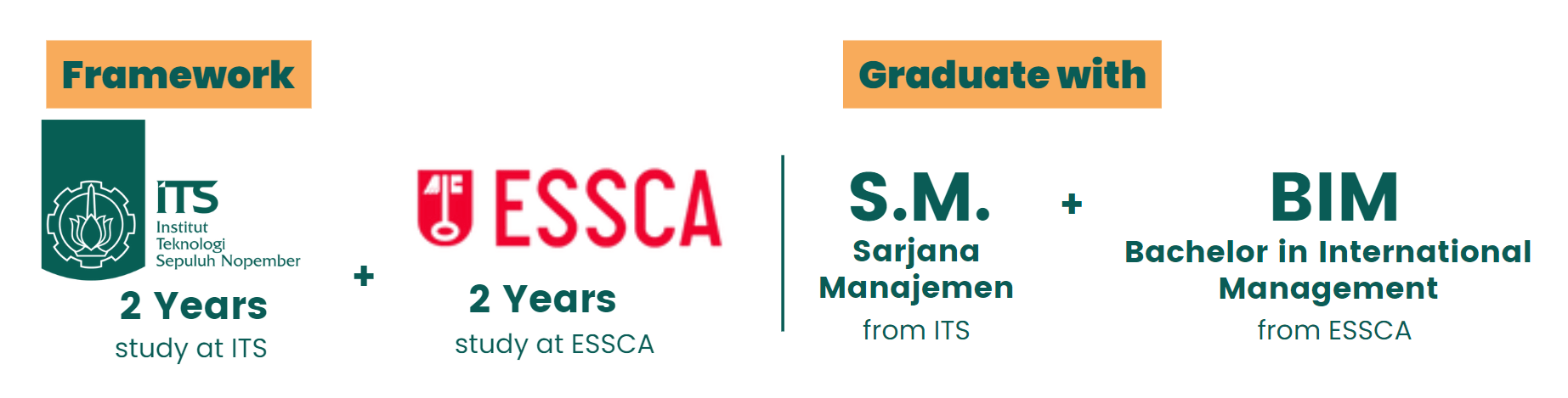 untuk program ini, siswa selama 4 semester akan belajar di ITS dan kemudian 4 semester belajar di ESCCA kampus. Kemudian, siswa akan mendapatkan 2 gelar, yaitu Sarjana Manajemen dari ITS dan Sarjana Manajemen Internasional dari ESCCA