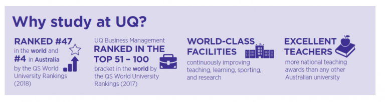Sebagai mahasiswa Manajemen Bisnis, anda akan dapat mengembangkan pengetahuan dan keterampilan sebagai seorang profesional yang dapat memahami dunia bisnis yang kompetitif dan berubah dari waktu ke waktu. Tim pengajar UQ adalah ahli di bidangnya, selalu bekerja untuk menemukan solusi bagi beberapa permasalahan bisnis yang ada di dunia. Kegiatan penelitian dan konsultasi dari tim pengajar UQ memastikan kualitas pengajaran di UQ sebagai yang terbaik dalam pengetahuan bisnis kontemporer, dan juga memenuhi persyaratan industri.