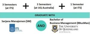 Mahasiswa akan menempuh studi selama tiga semester di ITS, diikuti dengan studi selama tiga semester di UQ dan kemudian kembali ke ITS selama satu semester untuk menyelesaikan tugas akhir. Setelah selesai, mahasiswa akan mendapatkan dua gelar sekaligus yaitu Sarjana Manajemen (SM) dari ITS dan Bachelor of Business Management (BBusMan) dari UQ.