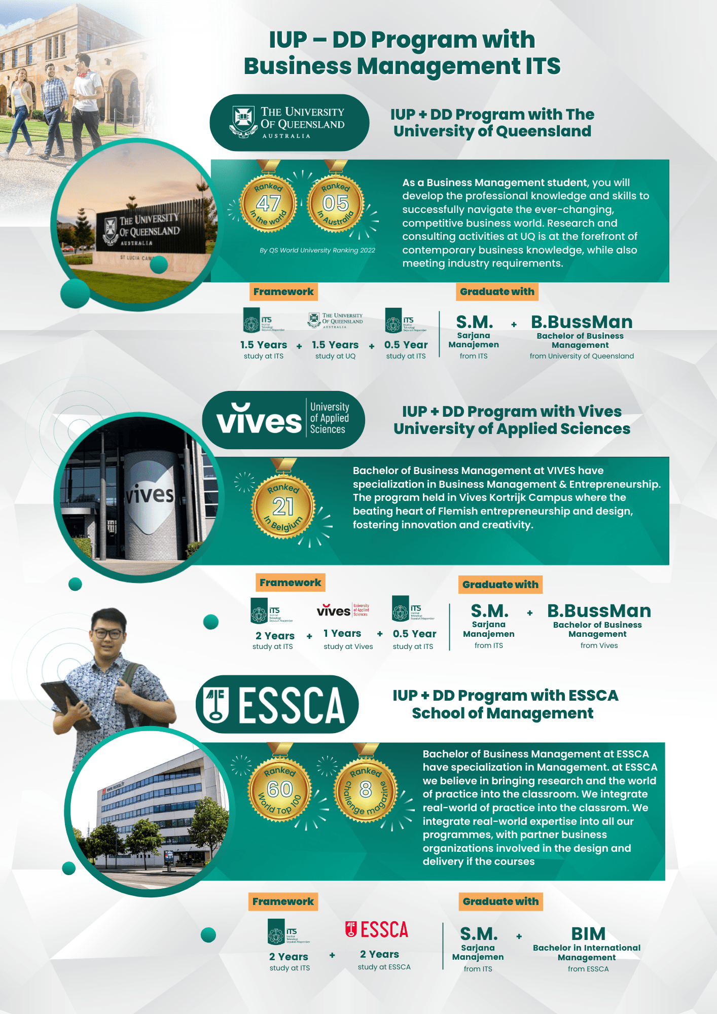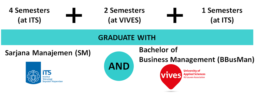 Siswa akan belajar selama 4 semester pertama di ITS, kemudian 2 semester lagi di VIVES. Lalu kembali ke ITS untuk menyelesaikan tesis sarjana. Setelah selelsai, siswa akan mendapatkan dua gelar sekaligus. Yaitu Sarjana Manajemen (S.M) dari ITS dan Bachelor of Business Management (B.BussMan) dari VIVES.
