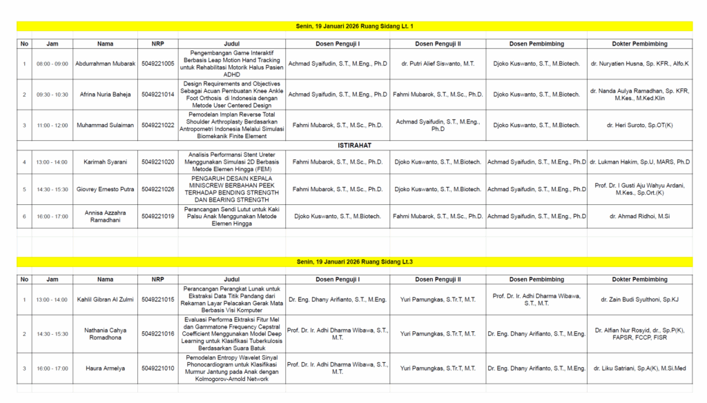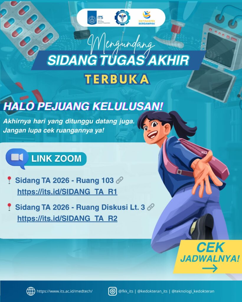 Agenda: Sidang Tugas Akhir Terbuka 2026 Departemen Teknologi Kedokteran – ITS mengundang Bapak/Ibu, rekan mahasiswa, dan masyarakat umum untuk