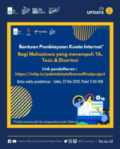 Institut Teknologi Sepuluh Nopember kembali memberikan bantuan pembiayaan kuota internet bagi mahasiswa yang menempuh Tugas Akhir, Tesis, dan Disertasi. Silahkan kepada mahasiswa yang eligible untuk mendaftar di https://intip.in/paketdatatelkomselfinalproject sebelum Sabtu, 23 Mei 2020, Pukul 17.00 WIB.