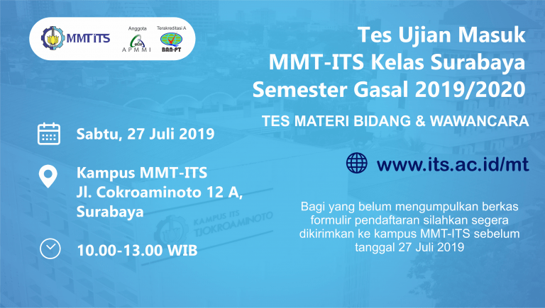 Menginfokan bahwa Pelaksanaan Tes Ujian Masuk MMT-ITS Kelas Surabaya Semester Gasal 2019/2020, akan dilaksanakan