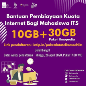 4. The Telkomsel data package subsidy package for the 4000 students, contains a 10GB data package to access all sites+a 30 GB Ilmupedia package to access the ITS learning portal. Students can register through the intip.in/paketdatatelkomsel4its, with the registration limit April 26, 2020, at 17:00 GMT+7.Further Information: