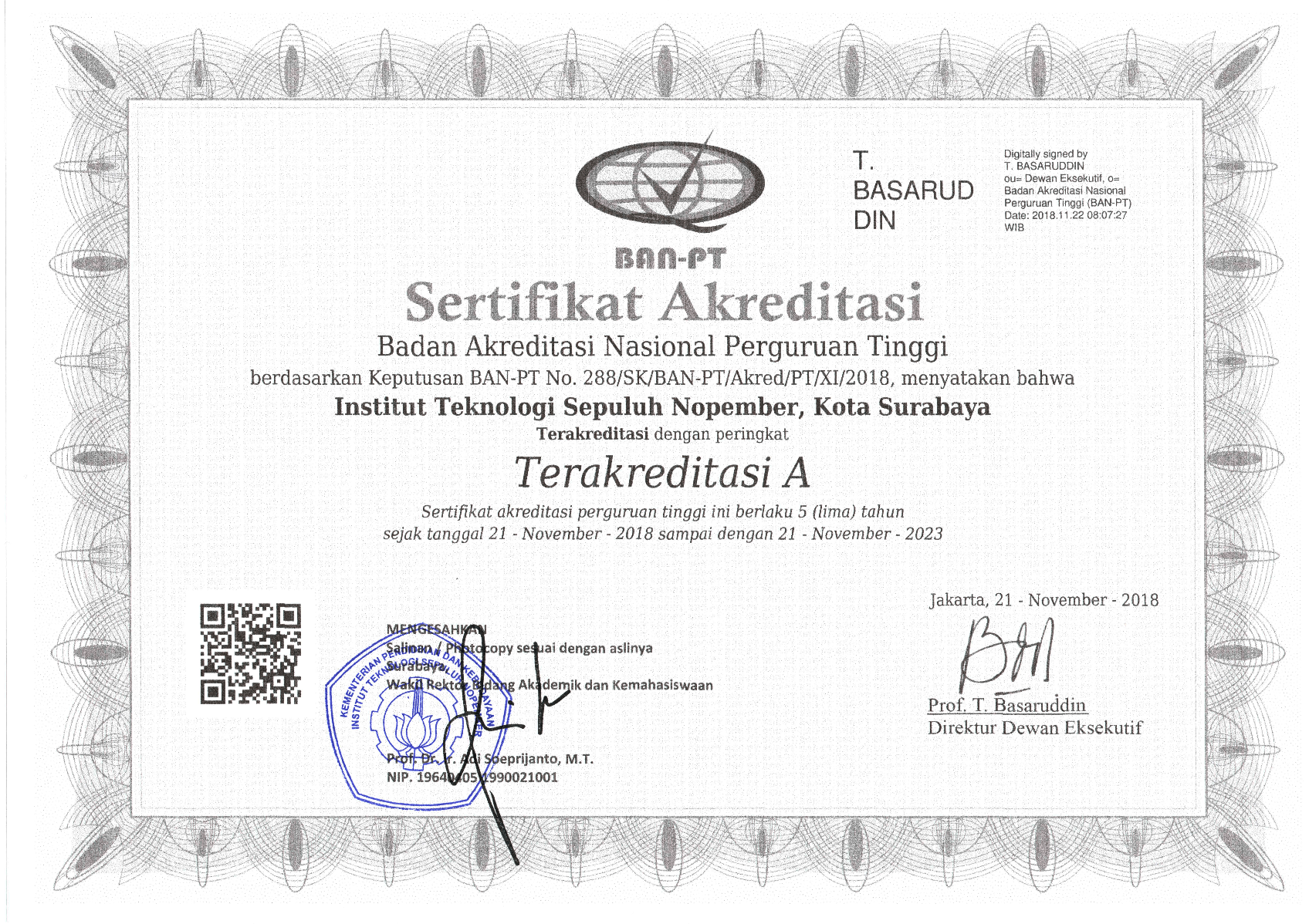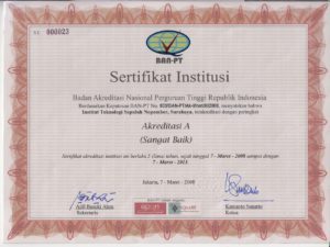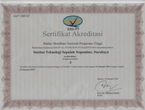 Institut Teknologi Sepuluh Nopember has been accredited by BAN-PT (national accreditation institution for universities). The score is A (maximum score). For further information and inquiries related to that accreditation status, feel free to contact us.