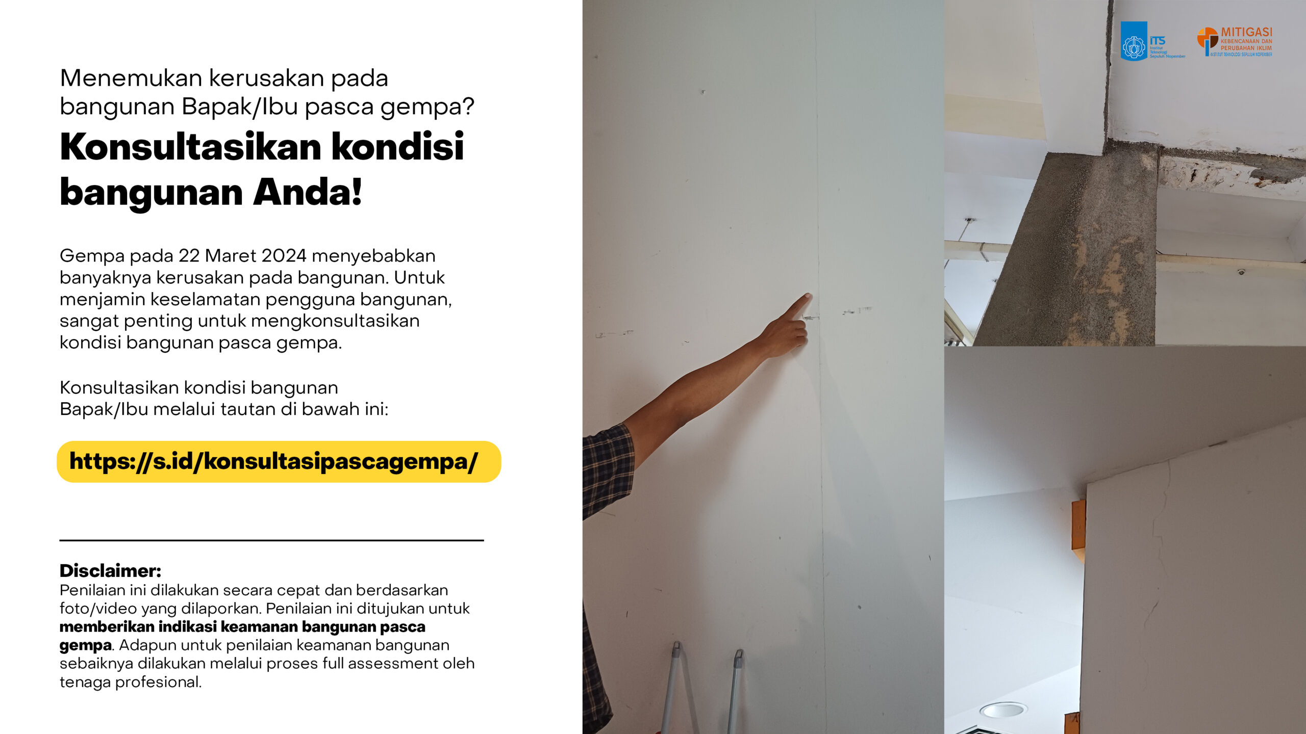 MKPI ITS – Gempa yang terjadi di dalam laut bagian utara Tuban Jawa Timur pada 22 Maret masih terus menunjukan aktivitas susulannya hingga hari ini. Kondisi ini berimbas pada kerusakan bangunan, tak hanya di Pulau Bawean sebagai pulau yang dekat dari titik gempa, namun juga hingga area Pulau Jawa. Mengerahkan kompetensi para pakar Teknik Sipil, Pusat Penelitian Mitigasi Kebencanaan dan Perubahan Iklim (MKPI) ITS bentuk satgas gempa untuk melayani konsultasi gratis.