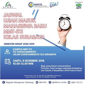 Ujian masuk dilaksanakan pada hari Sabtu, 8 Desember 2018 pukul 10.00-12.00 WIB di Kampus ITS Tjokroaminoto, Jalan Cokroaminoto 12A Surabaya 60264.